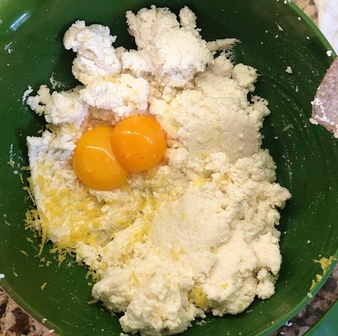 For the filling, strain the ricotta if needed. Mix with sugar, yolks and zest. Add cherries and pine nuts.