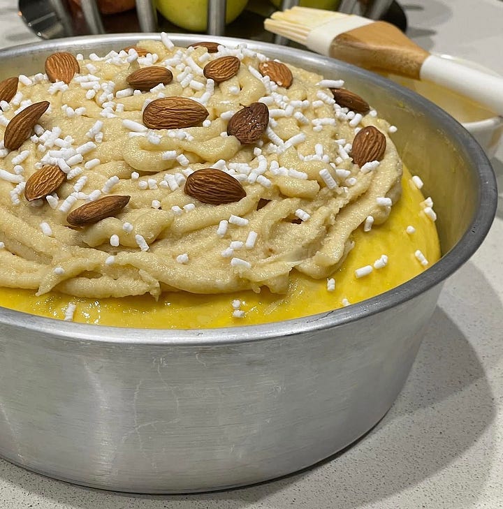 Pipe or spread on top, add sugar and almonds.