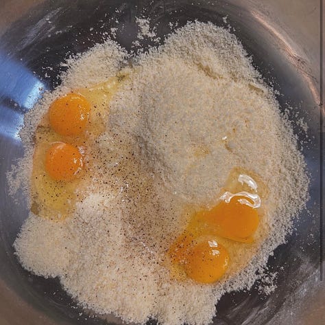 Grate the cheeses finely. Add eggs, salt and pepper, and mix.